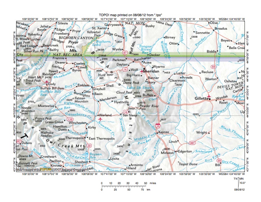 Today most drainage routes seen in figure 1 are north oriented or flow to north oriented rivers, although a close look at figure 1 reveals southeast oriented tributaries to the north oriented Bighorn and Powder Rivers. These barbed tributaries are evidence of south and southeast oriented flood flow channels that preceded the present day north oriented drainage systems. The south and southeast oriented floodwaters flowed across the entire region seen in figure 1 and were derived from the western margin of a thick North American ice sheet. Floodwaters were flowing from western Canada to and across the Bighorn Mountains region until Bighorn Mountains emergence forced floodwaters to flow around the Bighorn Mountains. Bighorn Mountains emergence occurred as floodwaters deeply eroded the surrounding region and as ice sheet related crustal warping raised the Bighorn Mountains as floodwaters flowed across them. Ice sheet crustal warping combined with deep glacial erosion underneath the ice sheet created a deep “hole” in which the ice sheet was located. The region seen in figure 1 could be considered to be a segment of the deep “hole’s” southwest rim. As the huge ice sheet melted space at the south end of deep “hole” was opened up and at least initially drained in a south direction using flood flow channels east of figure 1. The deep northeast oriented Yellowstone River valley (north of figure 1) eroded headward across Montana from this newly opened up deep “hole” space to capture the south and southeast oriented melt water floods and to divert the floodwaters in a northeast direction. Yellowstone River valley headward erosion beheaded south and southeast oriented flood flow channels in sequence and floodwaters on north ends of the beheaded flood flow channels reversed flow direction to create north oriented drainage routes. Northeast oriented valleys then eroded headward from these newly formed north oriented drainage routes to capture south and southeast oriented flood flow moving west of the actively eroding Yellowstone River valley head. This process was repeated, although on frequently on much smaller scales, as northeast oriented tributary valleys captured south and southeast oriented flood flow with the ultimate result that large north oriented drainage systems were created. The north oriented Powder River drainage system was created first with the north oriented Tongue River being created next and the north oriented Bighorn River drainage system being created still later on. This systematic and massive reversal of the south and southeast melt water flood flow occurred as the Bighorn Mountains were emerging to become the high mountain range they are today.