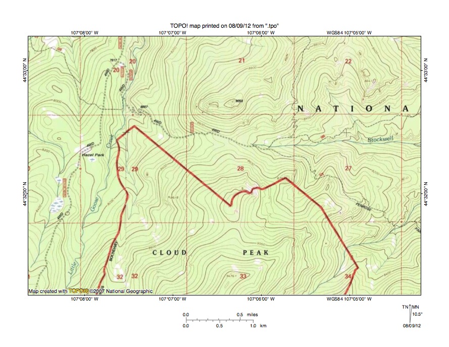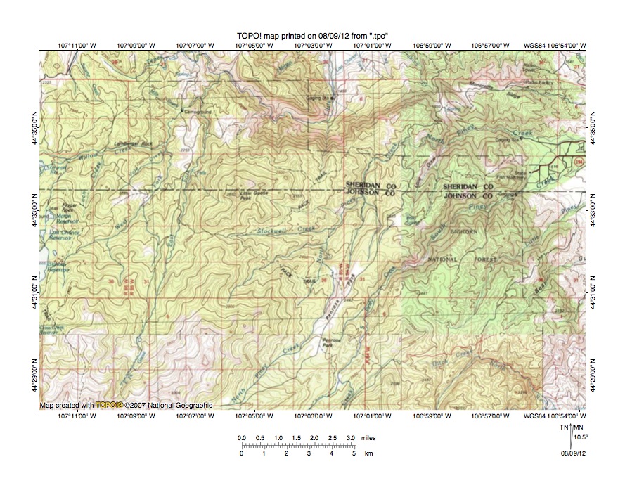 Figure 5: East Fork Little Goose Creek-North Piney Creek drainage divide area. United States Geological Survey map digitally presented using National Geographic Society TOPO software.