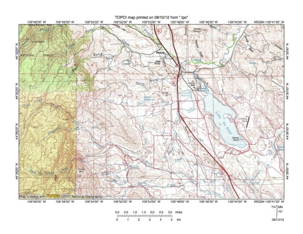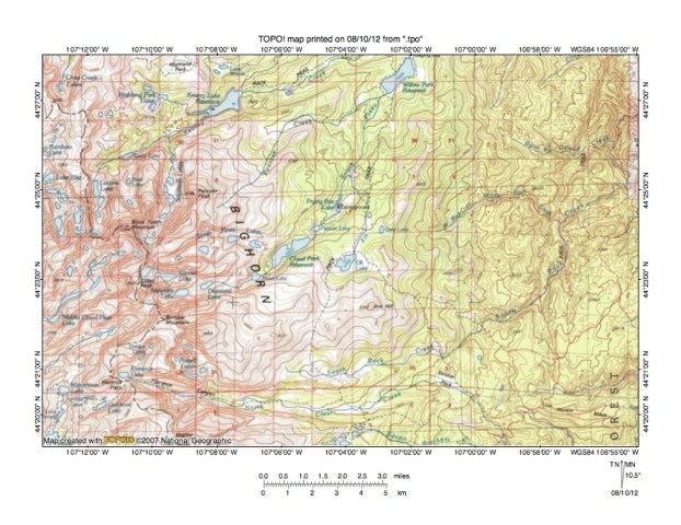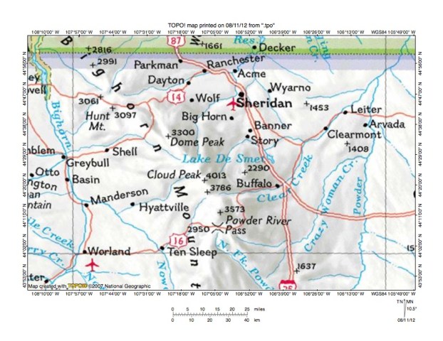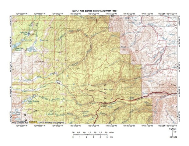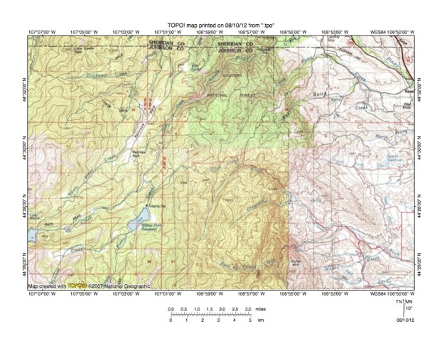 Figure 4: Detailed map of Piney Creek-Lake De Smet drainage divide area. United States Geological Survey map digitally presented using National Geographic Society TOPO software.