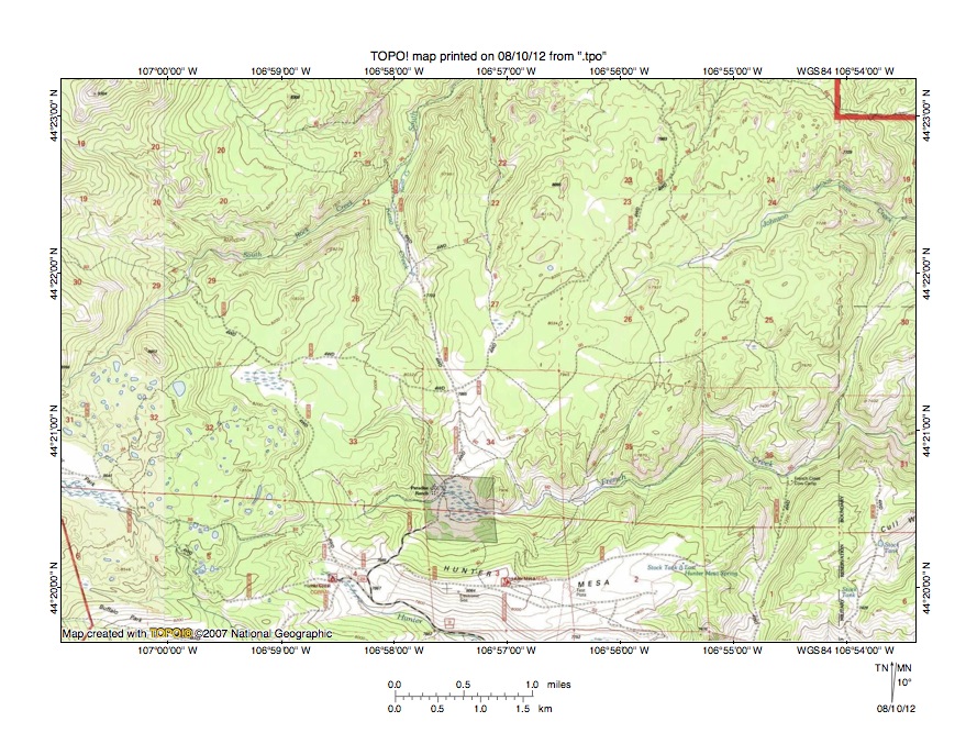Figure 6: Detailed map of South Piney Creek-North Rock Creek drainage divide area. United States Geological Survey map digitally presented using National Geographic Society TOPO software.