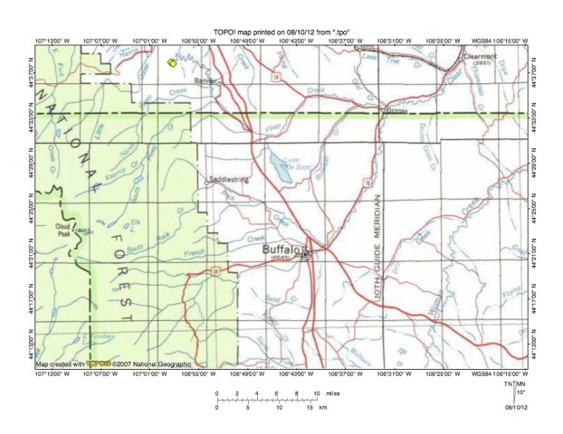 Figure 3: Piney Creek-Rock Creek drainage divide area east of Bighorn Mountains. United States Geological Survey map digitally presented using National Geographic Society TOPO software.