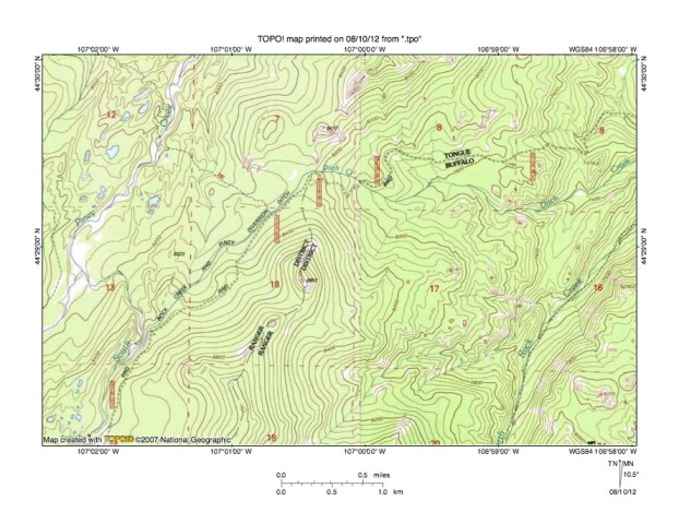 Figure 5: South Piney Creek-North Rock Creek drainage divide area. United States Geological Survey map digitally presented using National Geographic Society TOPO software.