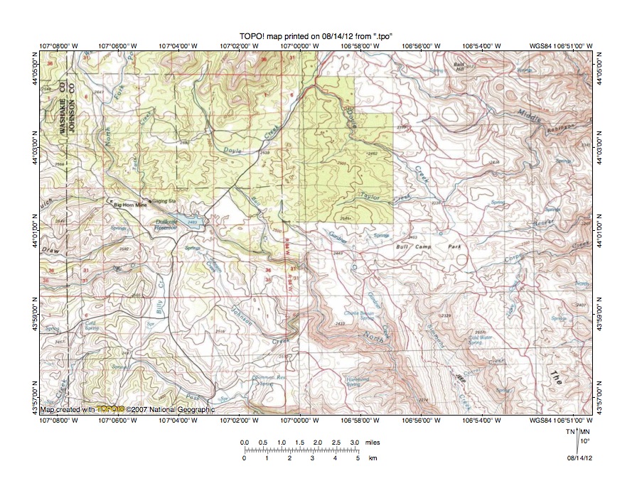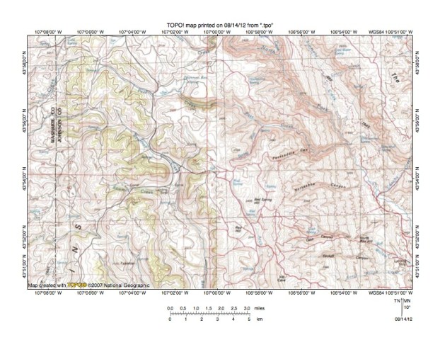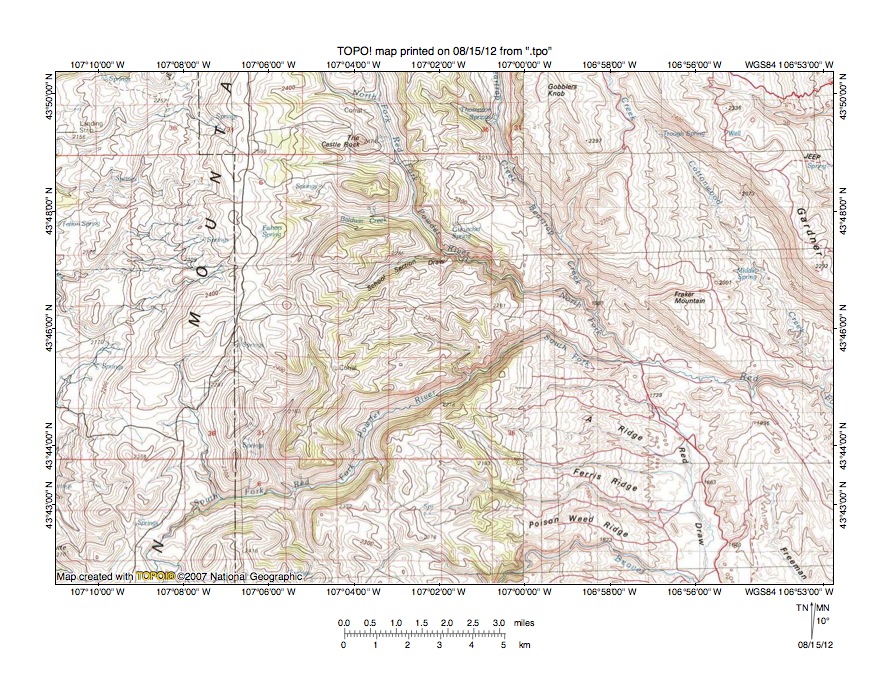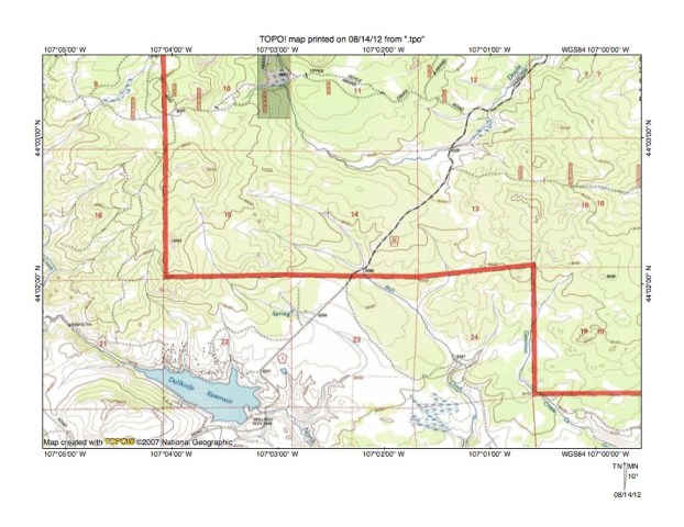 Figure 4: Red Fork Powder River-Middle Fork Powder River drainage divide area. United States Geological Survey map digitally presented using National Geographic Society TOPO software.