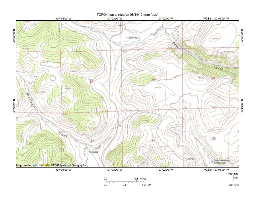 Figure 5: Beaver Creek-Middle Fork Powder River drainage divide area. United States Geological Survey map digitally presented using National Geographic Society TOPO software.