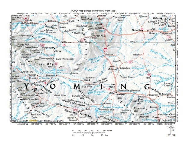 Figure 1: Buffalo Creek-South Fork Powder River drainage divide area location map (select and click on maps to enlarge). National Geographic Society map digitally presented using National Geographic Society TOPO software.