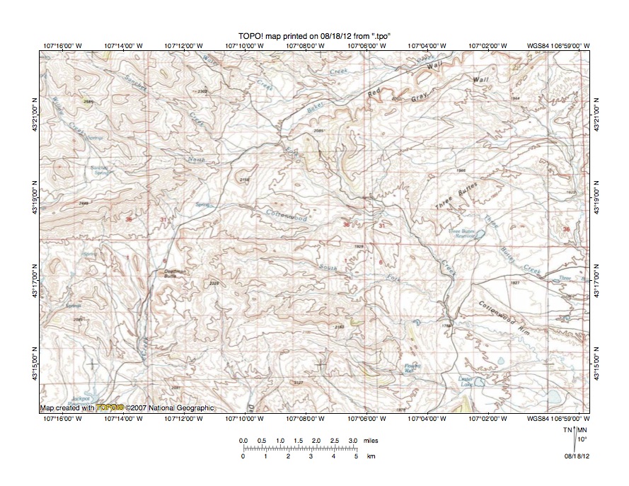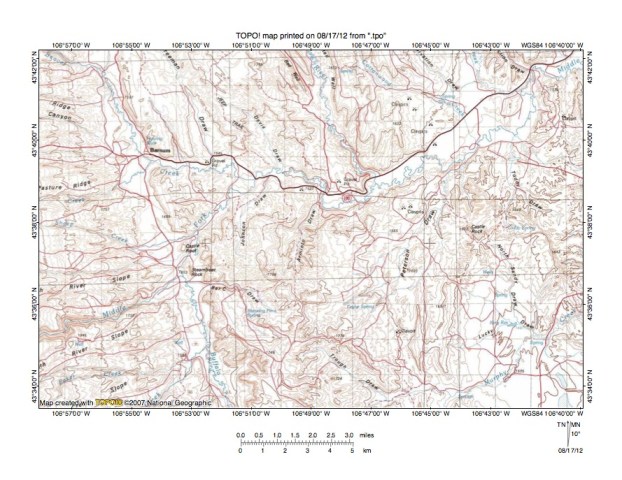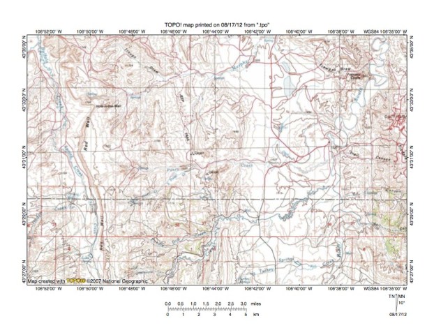 Figure 3: Middle Fork Powder River-Murphy Creek drainage divide area. United States Geological Survey map digitally presented using National Geographic Society TOPO software.