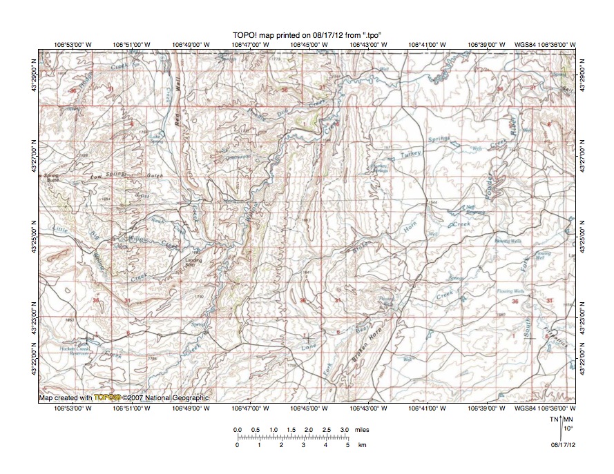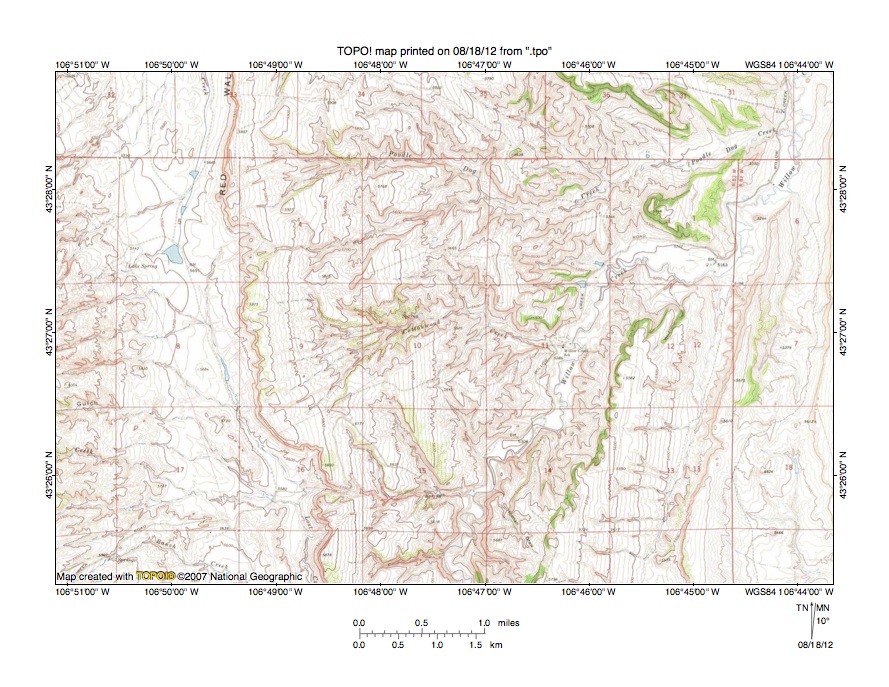 Figure 5: Willow Creek-South Fork Powder River drainage divide area. United States Geological Survey map digitally presented using National Geographic Society TOPO software.