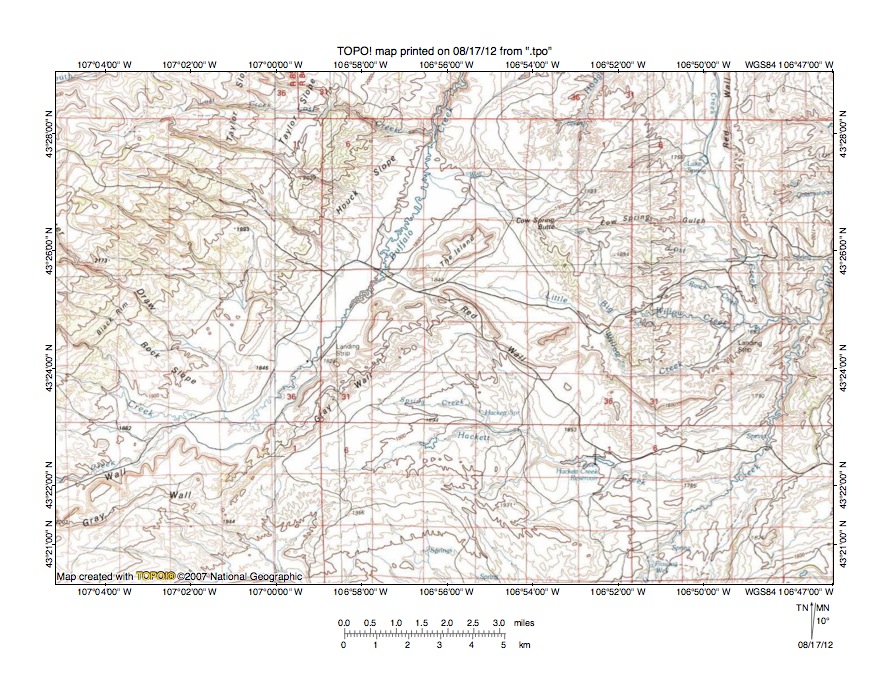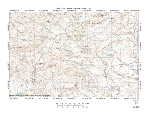 Figure 4: Buffalo Creek-South Fork Powder River drainage divide area. United States Geological Survey map digitally presented using National Geographic Society TOPO software.