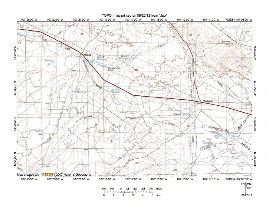 Figure 10: Detailed map of Deer Creek-South Fork Powder River drainage divide area. United States Geological Survey map digitally presented using National Geographic Society TOPO software.