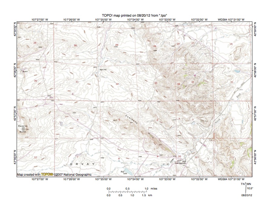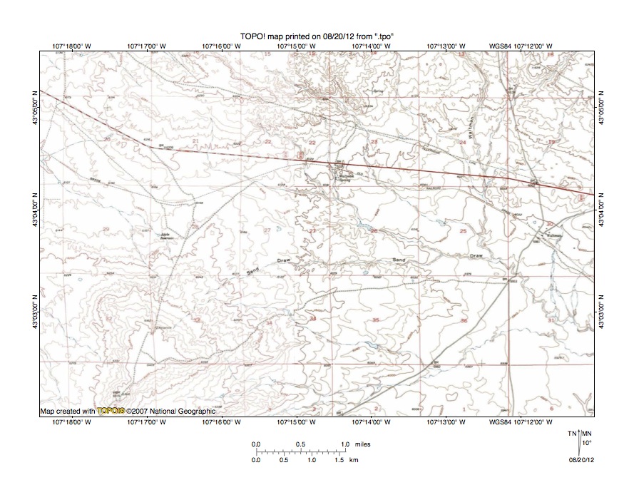 Figure 4: Alkali Creek-Branch Cave Gulch drainage divide area. United States Geological Survey map digitally presented using National Geographic Society TOPO software.