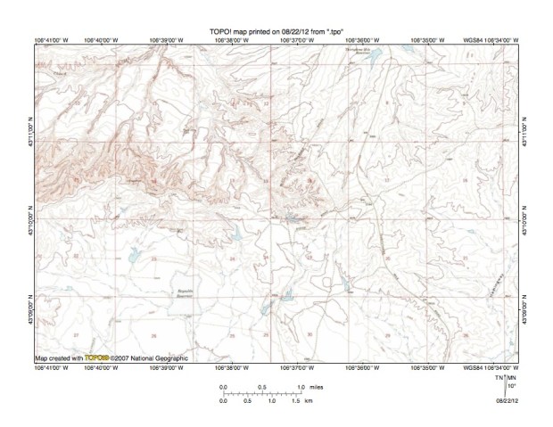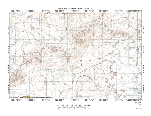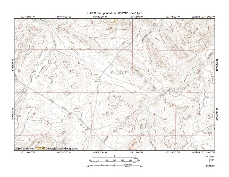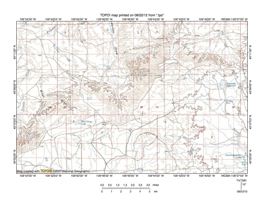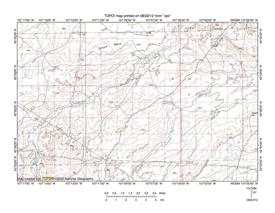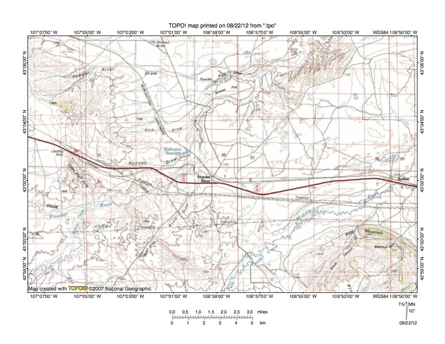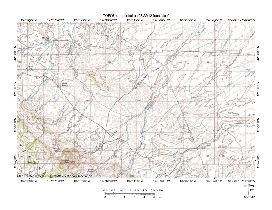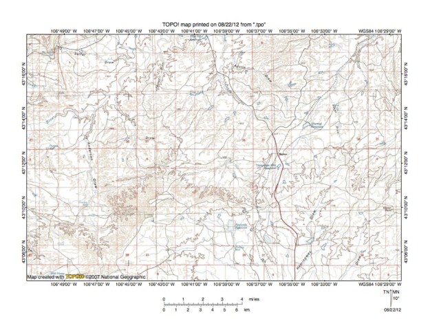 Figure 7: South Fork Powder River-North Fork Casper Creek drainage divide area. United States Geological Survey map digitally presented using National Geographic Society TOPO software.