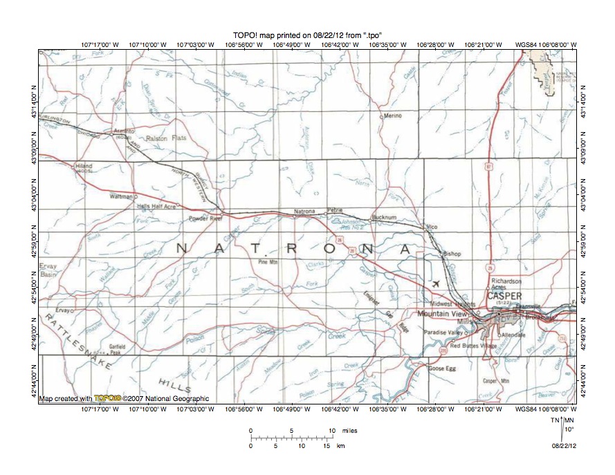Figure 1 provides a location map for the South Fork Powder River-Casper Creek drainage divide area in Natrona County, Wyoming. Casper is the largest city shown and is located in the southeast quadrant of figure 1 at the Laramie Range northwest end. The North Platte River flows in a north direction from Seminoe Reservoir near the south center edge of figure 1 to Pathfinder Reservoir and then turns to flow in a north-northeast direction to Casper. From Casper the North Platte River flows in an east and southeast direction to near the southeast corner of figure 1. East and south of figure 1 the North Platte River joins the South Platte River to form the east oriented Platte River, which flows to the Missouri River along the Nebraska-Iowa border. Casper Creek is a northeast, east, and south oriented tributary originating in the Rattlesnake Hills (in south center area of figure 1) and joining the North Platte River near Casper. Just north of the Casper Creek headwaters and at the northwest end of the Rattlesnake Hills are headwaters of the northeast and north-northeast oriented South Fork Powder River, which east of Kaycee joins the southeast oriented North Fork Powder River and the northeast oriented Middle Fork Powder River to form the east and north oriented Powder River. North of figure 1 the Powder River flows into Montana where it joins the northeast oriented Yellowstone River. The North Fork Powder River and the Middle Fork Powder River originate in the southern Bighorn Mountains, which are located in the north center region of figure 1. East of the Bighorn Mountains is the Powder River Basin. West of the Bighorn Mountains is the Bighorn Basin. The Bighorn Basin is drained by the north oriented Bighorn River, which north of figure 1 flows into Montana to join the northeast oriented Yellowstone River. The Bighorn River originates as the southeast oriented Wind River west of figure 1. The Wind River flows in a southeast direction from the west center edge of figure 1 between the Owl Creek Mountains and the Wind River Range to Riverton in the Wind River Basin. At Riverton the Wind River turns to flow in a northeast and north direction through Wind River Canyon (eroded across the east end of the Owl Creek Mountains) to near Thermopolis where the river name changes to become the Bighorn River. The South Fork Powder River-Casper Creek drainage divide area investigated in this essay is located south and east of the South Fork Powder River and north and west of northeast and east oriented Casper Creek segments.