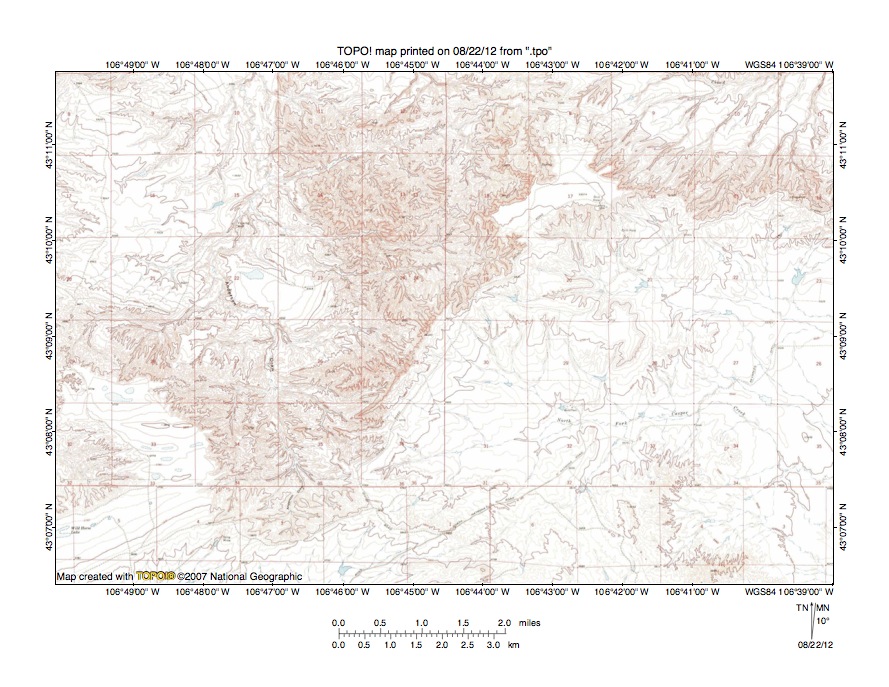 Figure 6: South Fork Powder River-Middle Fork Casper Creek drainage divide area. United States Geological Survey map digitally presented using National Geographic Society TOPO software.