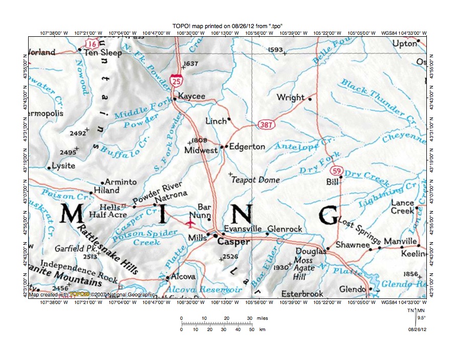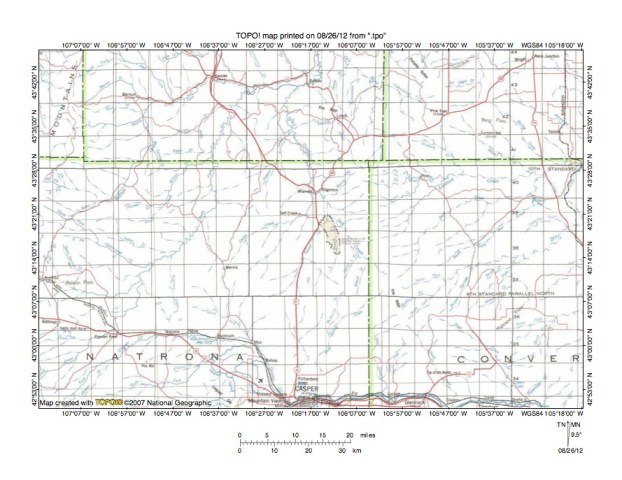 Figure 1: Salt Creek-North Platte River drainage divide area location map (select and click on maps to enlarge). National Geographic Society map digitally presented using National Geographic Society TOPO software.