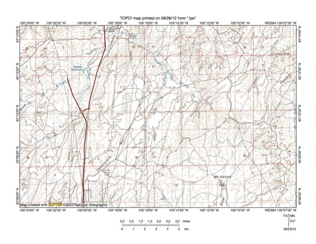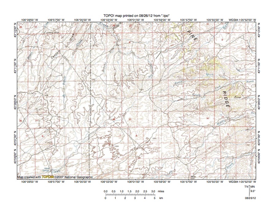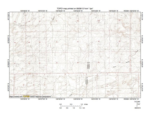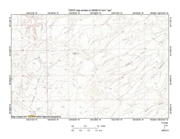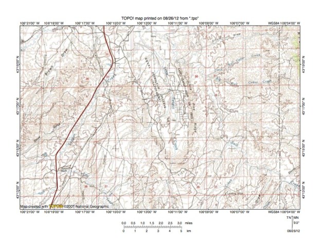 Figure 5: East Teapot Creek-McKenzie Draw drainage divide area. United States Geological Survey map digitally presented using National Geographic Society TOPO software.