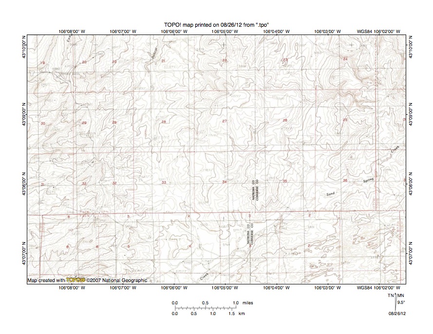 Figure 3: Salt Creek-Sand Spring Creek drainage divide area south. United States Geological Survey map digitally presented using National Geographic Society TOPO software.