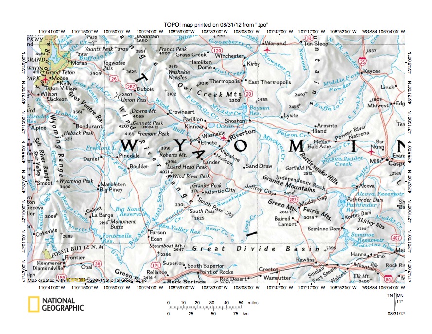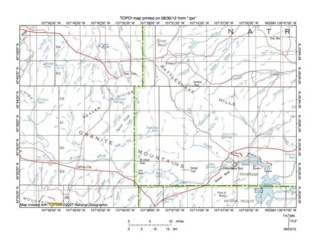 Figure 1: Deer Creek-Sweetwater River drainage divide area location map (select and click on maps to enlarge). National Geographic Society map digitally presented using National Geographic Society TOPO software.
