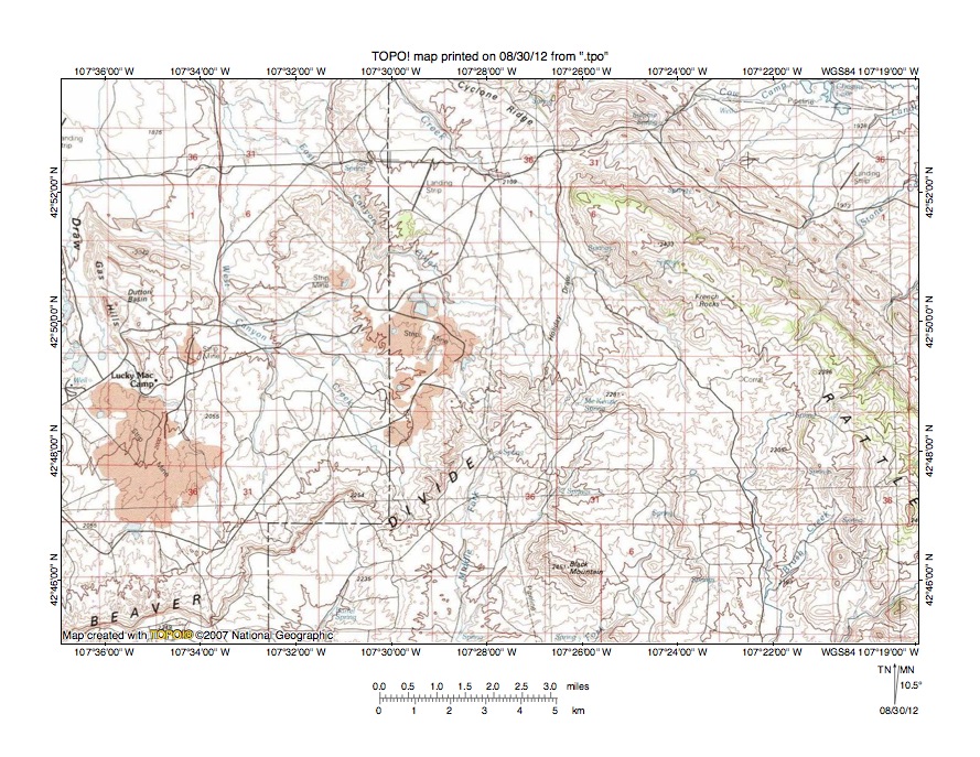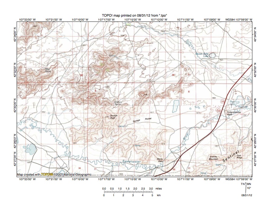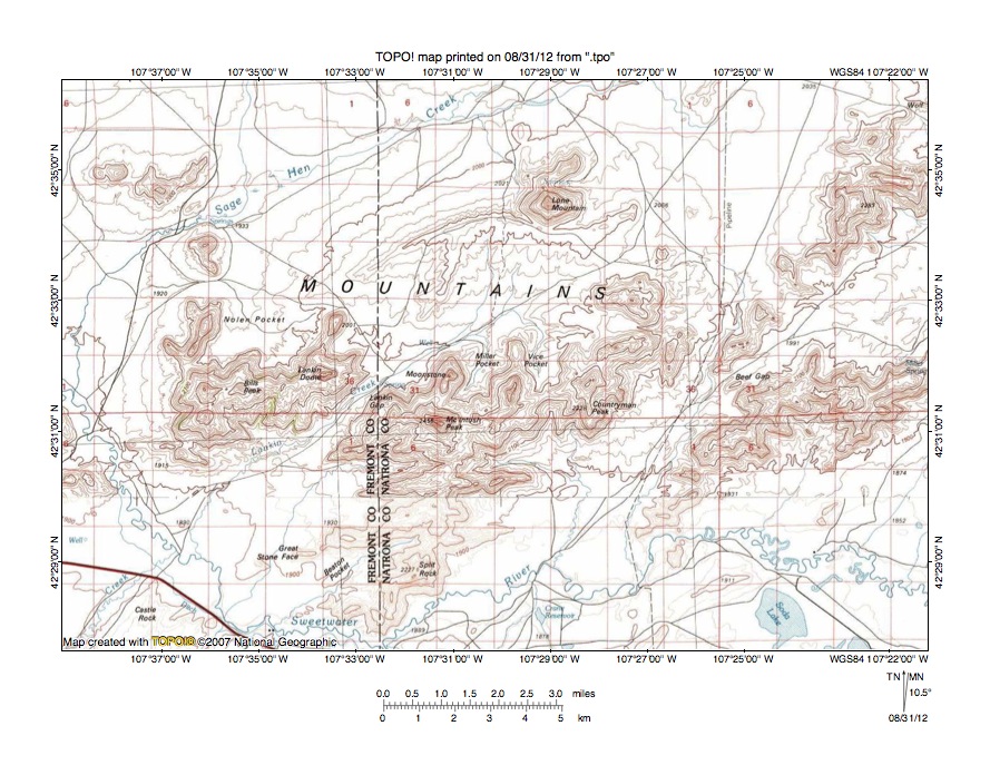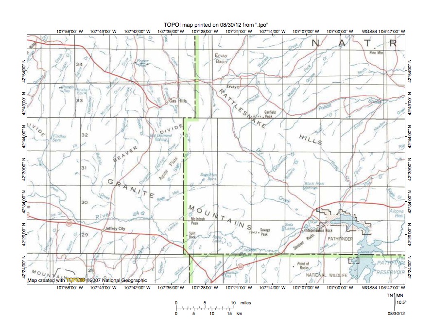 Figure 10: Sage Hen Creek-Sweetwater River drainage divide area. United States Geological Survey map digitally presented using National Geographic Society TOPO software.