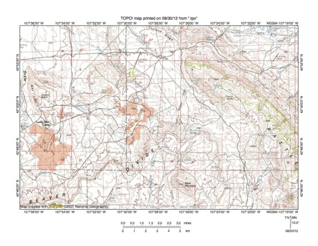 Figure 2: Detailed location map Deer Creek-Sweetwater River drainage divide area. United States Geological Survey map digitally presented using National Geographic Society TOPO software.