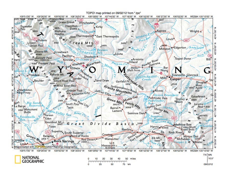 Figure 1: Wind River-Sweetwater River drainage divide area location map (select and click on maps to enlarge). National Geographic Society map digitally presented using National Geographic Society TOPO software.