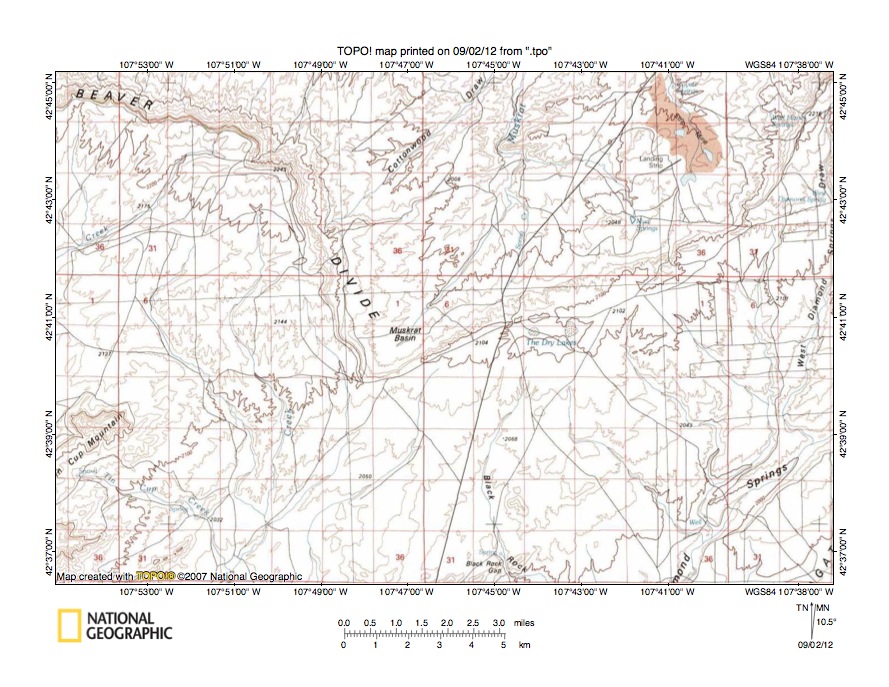 Figure 3: Muskrat Creek-Sweetwater River drainage divide area. United States Geological Survey map digitally presented using National Geographic Society TOPO software.