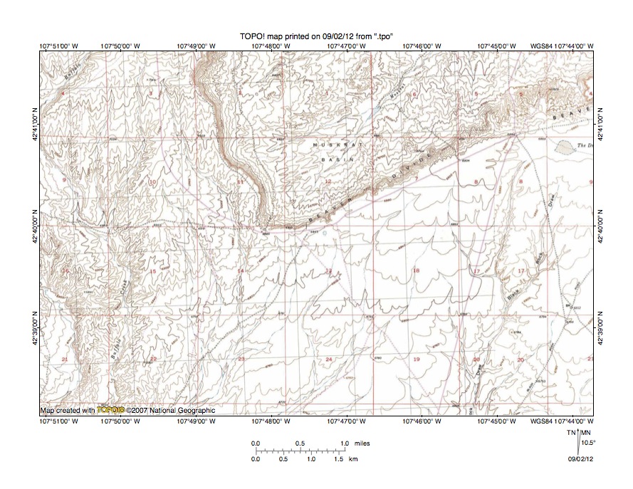 Figure 4 provides a detailed topographic map of the Muskrat Creek-Buffalo Creek drainage divide area seen in less detail in figure 3. The map contour interval for figure 4 is 20 feet. Muskrat Basin is labeled and is surrounded by the east-facing Beaver Divide escarpment to the west and by the northwest-facing Beaver Divide escarpment to the south and east. Muskrat Creek originates in section 12 and flows in a northeast direction to the north edge of figure 4. North of figure 4 Muskrat Creek flows in a north, northwest, and west direction to the north oriented Wind River with water eventually reaching the northeast oriented Yellowstone River. Buffalo Creek can be seen flowing in a south-southwest, south-southeast and south direction near the west edge of figure 4 and south of figure 4 flows to the east oriented Sweetwater River with water eventually reaching the north, northeast, east, and southeast oriented North Platte River. Black Rock Draw flows in a south-southwest direction in the east half of figure 4 and south of figure 4 also flows to the east oriented Sweetwater River. The steep Beaver Divide escarpment surrounding Muskrat Basin is more than 100 feet high and elevations decrease although at a more gradual rate as one proceeds into Muskrat Basin. A (hanging) through valley links the northeast oriented Muskrat Creek headwaters valley with south and south-southwest oriented Buffalo Creek tributary valleys and represents a low point on the crest of the Beaver Divide escarpment east of the corner of sections 11, 12, 13, and 14. The through valley floor elevation is between 6840 and 6860 feet. Elevations along the Beaver Divide escarpment crest rise in both directions with elevations near the north edge of figure 4 (west half) being greater than 7200 feet and elevations in section 8 (near east edge) being greater than 6900 feet. North and east of figure 4 elevations along the Beaver Divide escarpment rise to more than 7200 feet. Depending on how the through valley is viewed it could be anywhere from 40 to more than 340 feet deep. The through valley was eroded first by south and southeast oriented flood flow at a time when the deep Wind River Basin north of Beaver Divide did not exist. Next there was a massive reversal of flood flow to erode the Wind River Basin and the north oriented Beaver Divide headcut. Finally headward erosion of the Sweetwater River valley captured the north oriented flood flow and floodwaters south of the newly eroded Beaver Divide escarpment flowed in a south direction to the Sweetwater River valley.