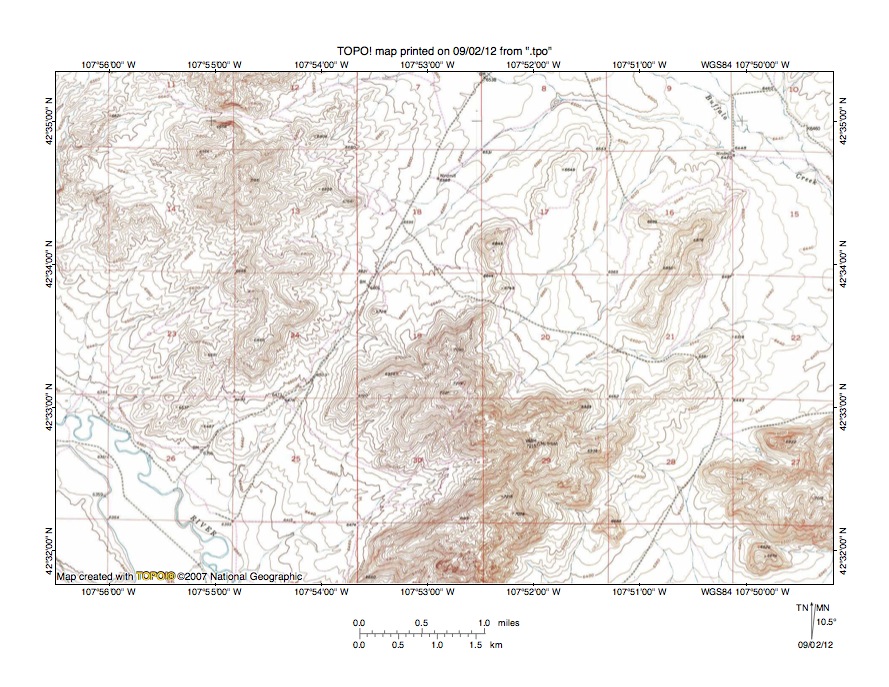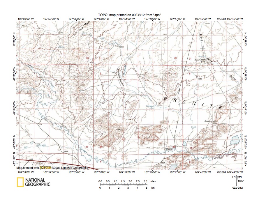 Figure 5: Buffalo Creek-Sweetwater River drainage divide area. United States Geological Survey map digitally presented using National Geographic Society TOPO software.