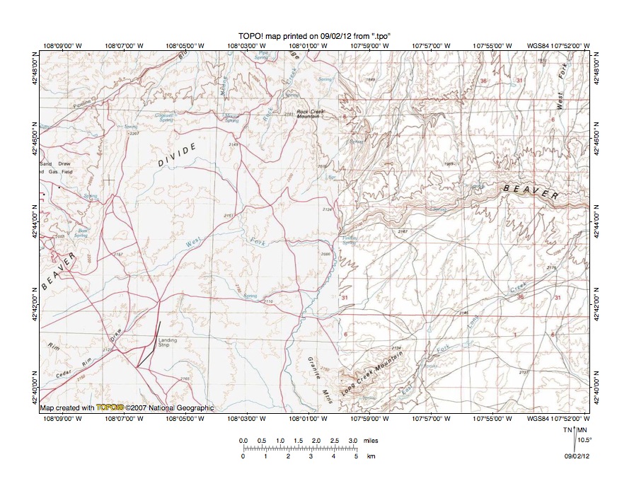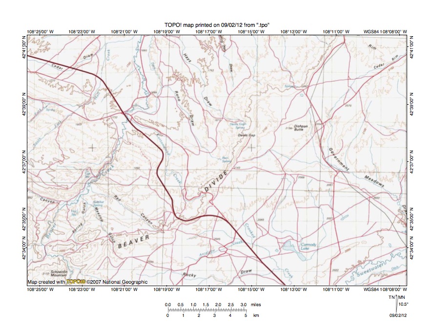 Figure 9: Beaver Creek-Sweetwater River drainage divide area. United States Geological Survey map digitally presented using National Geographic Society TOPO software.