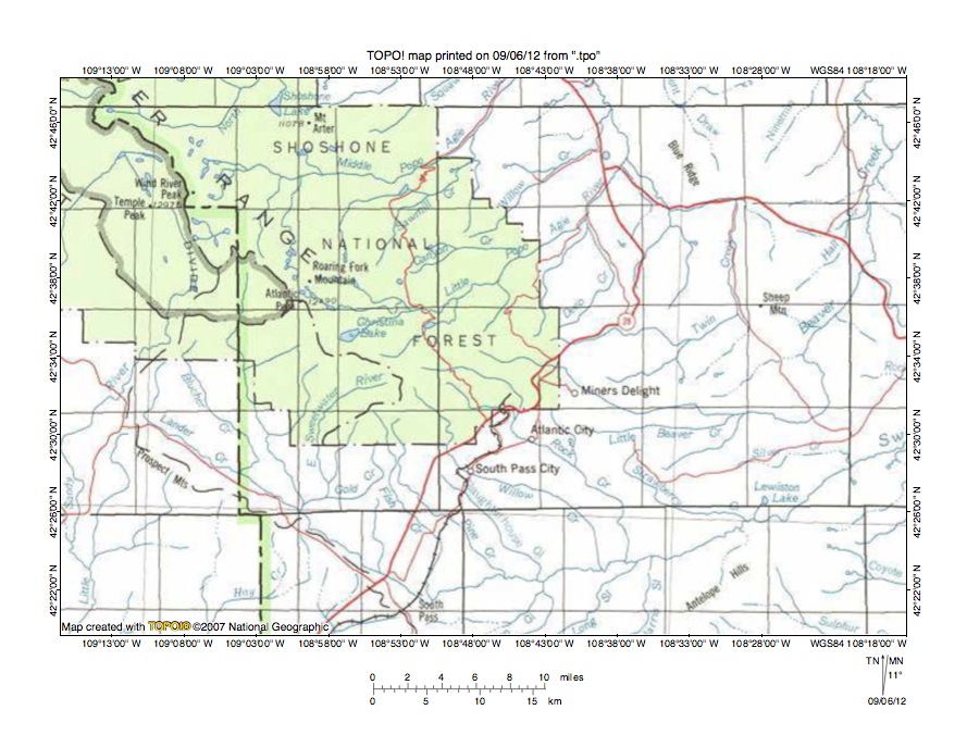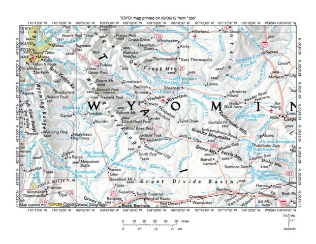 Figure 1: Popo Agie River-Sweetwater River drainage divide area location map (select and click on maps to enlarge). National Geographic Society map digitally presented using National Geographic Society TOPO software.