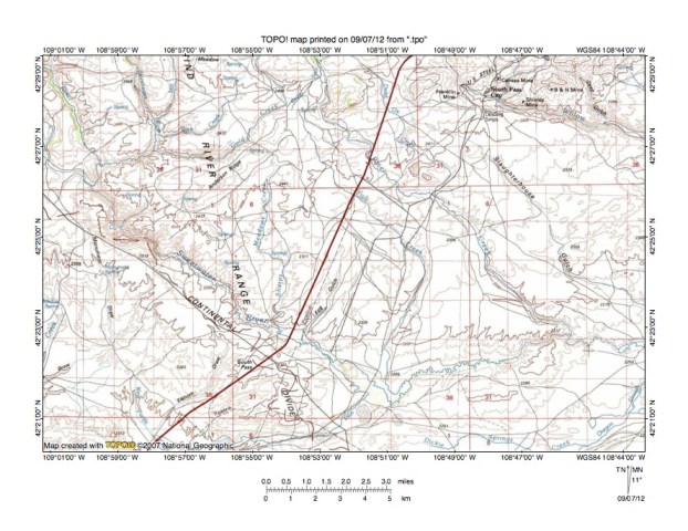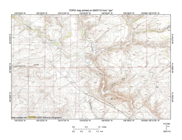Figure 9: Pine Creek-Sweetwater River drainage divide area. United States Geological Survey map digitally presented using National Geographic Society TOPO software.