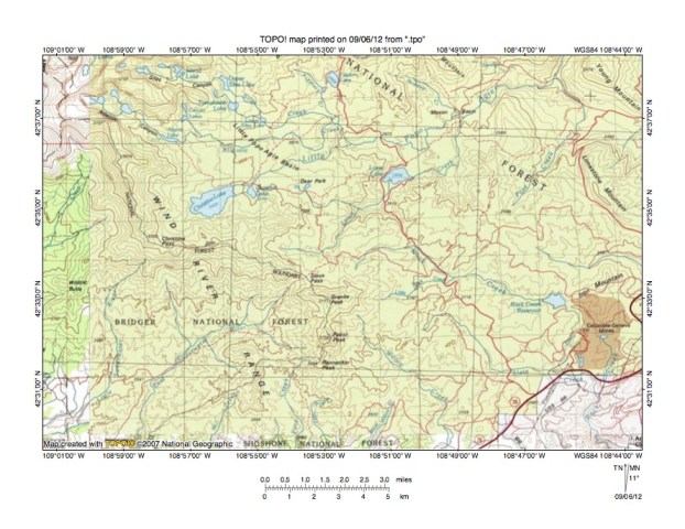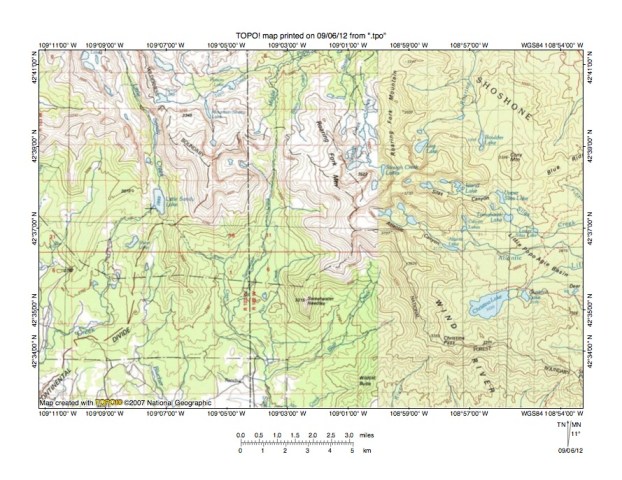 Figure 4: Detailed map of Middle Popo Agie River-Sweetwater River drainage divide area. United States Geological Survey map digitally presented using National Geographic Society TOPO software.