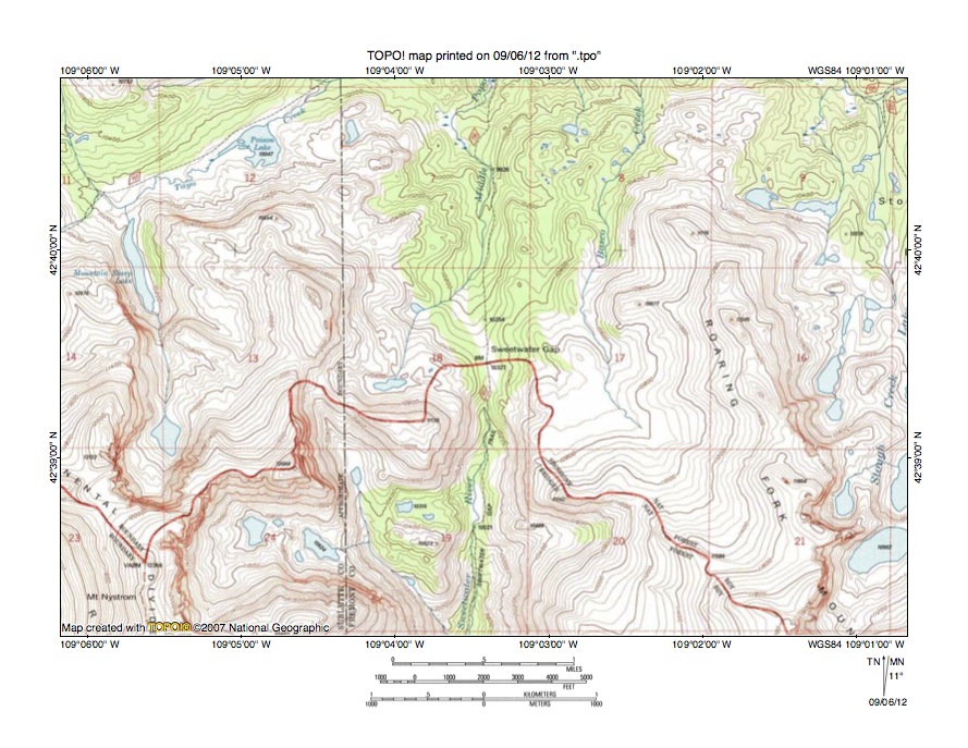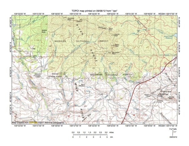 Figure 8: Detailed map of East Sweetwater River-Pine Creek drainage divide area. United States Geological Survey map digitally presented using National Geographic Society TOPO software.