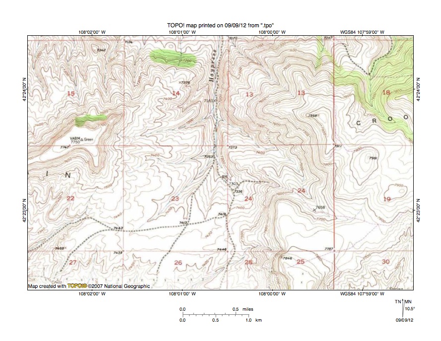 Figure 10: Detailed map of Haypress Creek-East Alkali Creek drainage divide area. United States Geological Survey map digitally presented using National Geographic Society TOPO software.