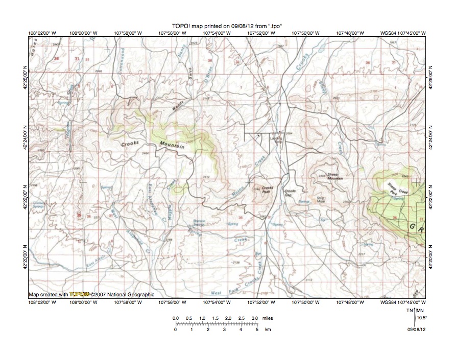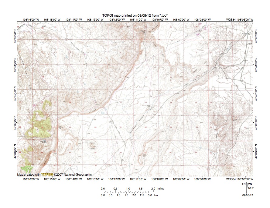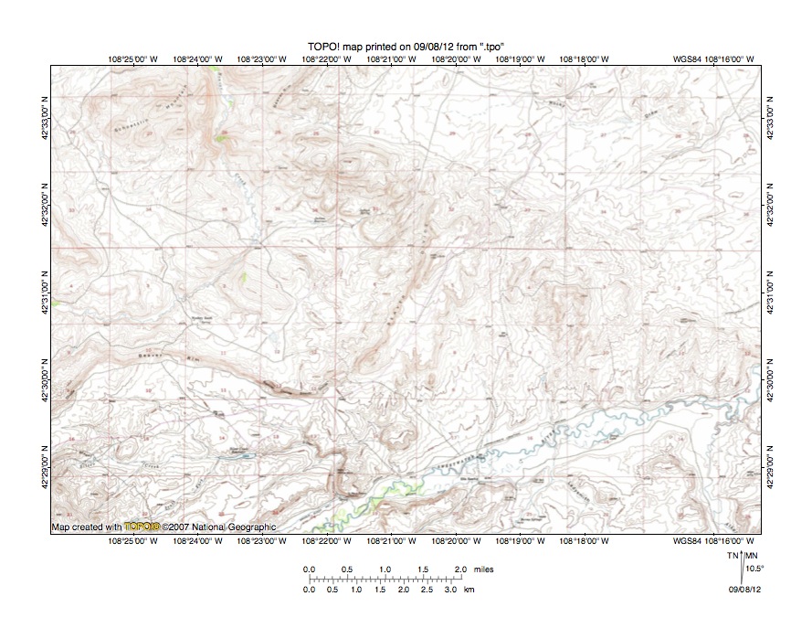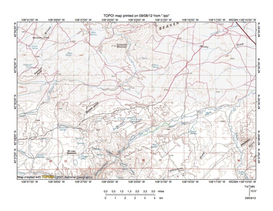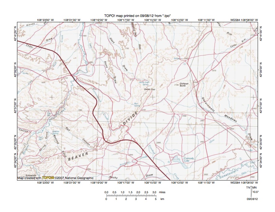 Figure 5: Beaver Creek- Sweetwater River drainage divide area. United States Geological Survey map digitally presented using National Geographic Society TOPO software.