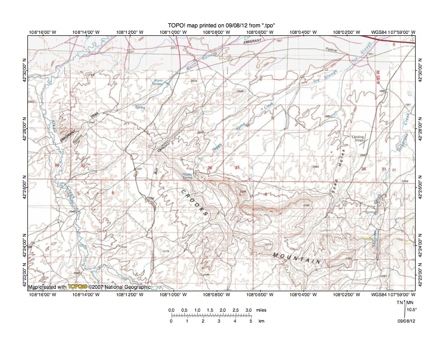 Figure 8: Detailed map of Happy Spring Creek-East Alkali Creek drainage divide area. United States Geological Survey map digitally presented using National Geographic Society TOPO software.