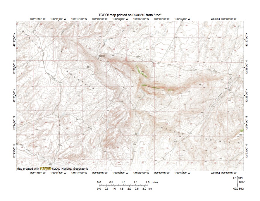 Figure 1 provides a location map for the Beaver Creek-Sweetwater River drainage divide area between the Wind River Range southeast end and Crooks Mountain and illustrates a region in west-central Wyoming. Grand Teton National Park is located near the northwest corner of figure 1. Togwotee Pass is located east of Grand Teton National Park. The Wind River flows in a southeast direction from near Togwotee Pass between the Wind River Range and the Owl Creek Mountains to Riverton in the Wind River Basin. At Riverton the Wind River turns to flow in a northeast and north direction across the Owl Creek Mountains eastern end and to enter the Bighorn Basin near Thermopolis. Once in the Bighorn Basin the river changes its name to become the Bighorn River. From Thermopolis the Bighorn River flows in a north direction to the north edge of figure 1 and north of figure 1 in Montana the Bighorn River joins the northeast oriented Yellowstone River. Beaver Creek originates east of Granite Peak near the Wind River Range southeast end and flows in an east and north direction to join the Wind River near Riverton. The Sweetwater River originates near the Wind River Range southeast end west and slightly north of Granite Peak and flows in a south and south-southeast direction to South Pass. At South Pass the Sweetwater River turns to flow in an east-northeast and east direction between the Granite Mountains and Green Mountains to join the North Platte River at Pathfinder Reservoir. West of the Green Mountains and south of the Sweetwater River is Crooks Mountain, which is drained by Sweetwater River tributaries. The North Platte River flows in a north direction from the south edge of figure 1 (east half) to Seminoe, Pathfinder, and Alcova Reservoirs and then turns to flow in a northeast direction to Casper at the Laramie Mountains northwest end. At Casper the North Platte River turns to flow in an east direction to the east center edge of figure 1 and east of figure 1 the North Platte River flows in a southeast direction to reach Nebraska and the east oriented Platte River. The Green River originates west of Gannett Peak near the Wind River Range northwest end and flows in a south direction to the south edge of figure 1 (near the town of Green River). South of figure 1 in Colorado the Green River joins the southwest oriented Colorado River. The Beaver Creek-Sweetwater Creek drainage divide area between the Wind River Range and Crooks Mountain is located south and east of Beaver Creek, east of the Wind River Range, and includes the Sweetwater River tributaries draining the Crooks Mountain area, which is located west of the Green Mountains.