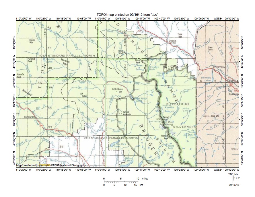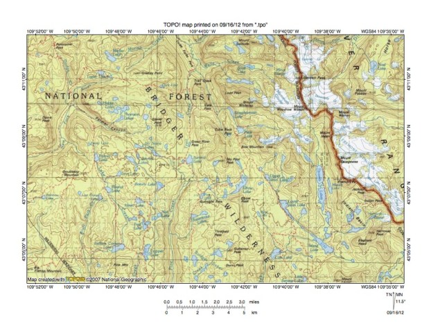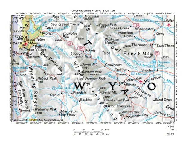 Figure 1: Wind River-Green River drainage divide area location map (select and click on maps to enlarge). National Geographic Society map digitally presented using National Geographic Society TOPO software.