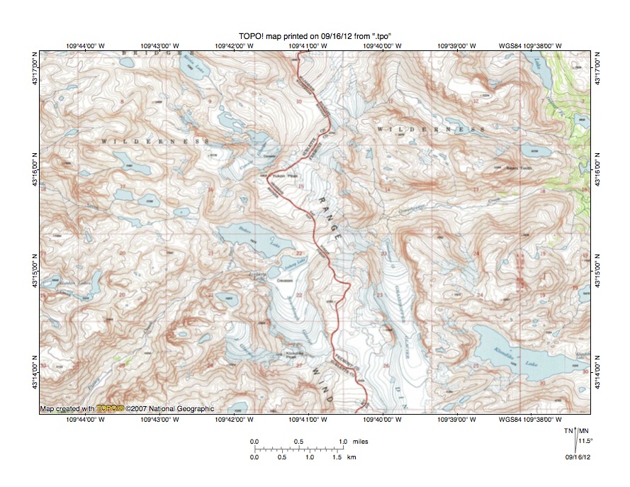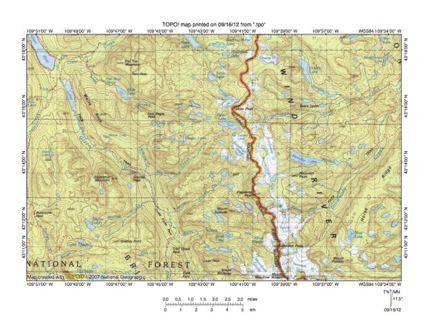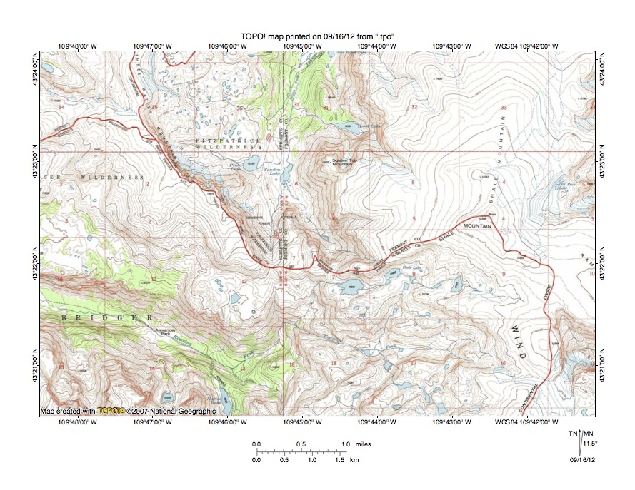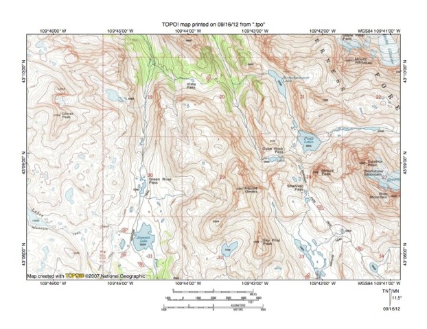Figure 2: Detailed location map Wind River-Green River drainage divide area. United States Geological Survey map digitally presented using National Geographic Society TOPO software.