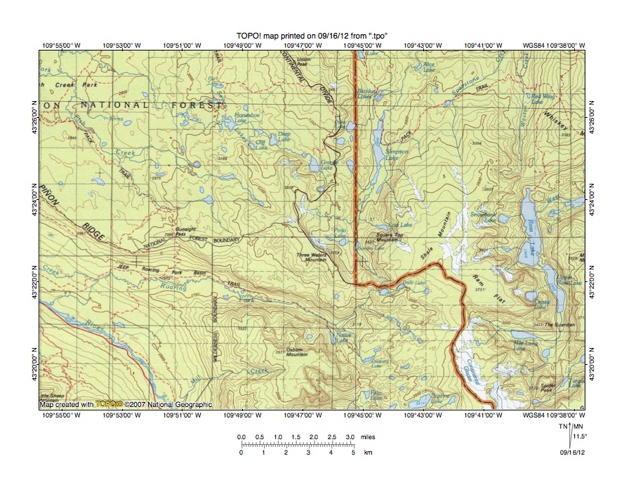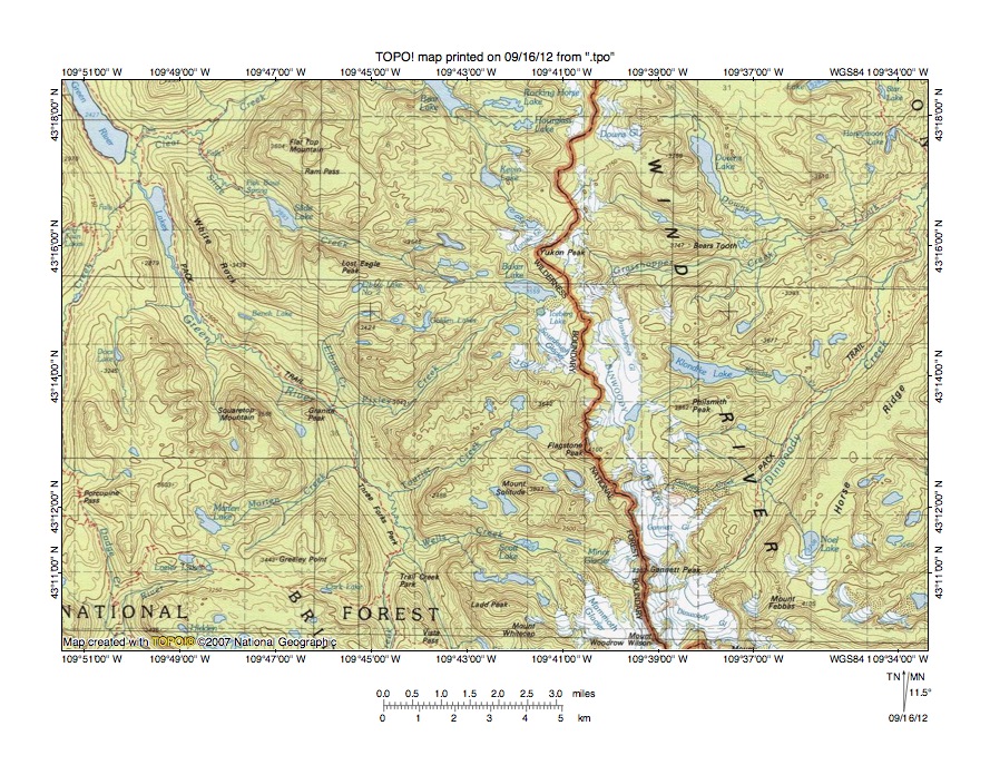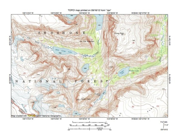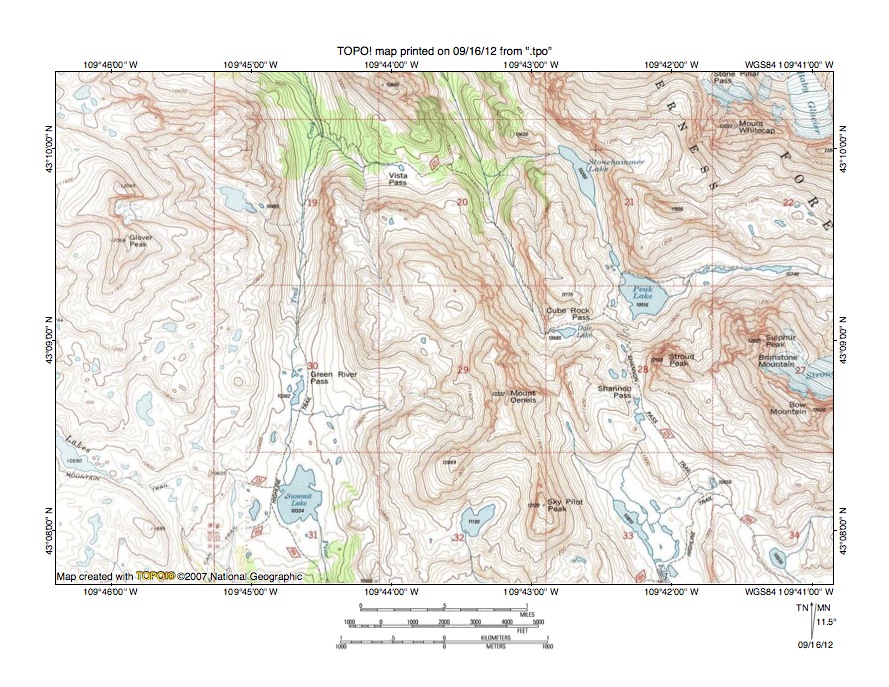 Figure 4: Detailed map of Green River-Pine Creek drainage divide area. United States Geological Survey map digitally presented using National Geographic Society TOPO software.