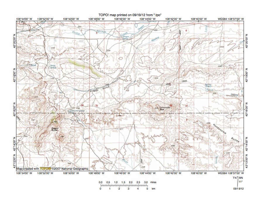 Figure 3 provides a topographic map of Oregon Gulch-Bear Creek drainage divide area. The map contour interval for figure 3 is 20 meters. Oregon Buttes is located in the southwest quadrant of figure 3. Edmund Springs is located near Oregon Buttes and Bear Creek originates at Edmund Springs and then flows in a southeast direction to the south center edge of figure 3. South of figure 3 Bear Creek joins other streams flowing into the Red Desert Basin region where the surface drainage routes end at Hay Reservoir. North of Edmund Springs are headwaters of east and northeast oriented Oregon Gulch, which drains to the north edge of figure 3 (slightly east of center). North of figure 3 Oregon Gulch drains to the east-northeast oriented Sweetwater River with water eventually reaching the Gulf of Mexico. Dickie Springs Creek is an east oriented Oregon Gulch tributary located near the north edge of figure 2. Continental Peak is a high point located south and east of the center of figure 3. North of Continental Peak are headwaters of east-southeast oriented Sand Creek, which flows to the east center edge of figure 3 and east and south of figure 3 Sand Creek joins other streams flowing to Hay Reservoir in the Great Divide Basin where the drainage route ends. The region between Oregon Buttes and Continental Peak was eroded by southeast oriented flood flow, which was beheaded by headward erosion of the deeper northeast oriented Oregon Gulch valley. The high point at Oregon Buttes is 2624 meters and the high point at Continental Peak is 2570 meters. Low points on the Oregon Gulch-Bear Creek drainage divide are in the 2340 -2360 meter range suggesting almost 200 meters of bedrock material has been stripped from the region. The similarity of elevations at the tops of these two buttes suggests the butte tops are remnants of a former erosion surface that once extended across the entire region. Deep south and southeast oriented flood flow channels eroded headward into the region and stripped the bedrock surface leaving isolated buttes such as Oregon Buttes and Continental Peak as markers to demonstrate what was once present. At the time floodwaters eroded the region there was no east-northeast oriented Sweetwater River valley north of figure 3 and the present day north oriented Wind-Bighorn River drainage route further to the north was a south oriented flood flow channel. While some of the south oriented floodwaters crossing the figure 3 region may have come from that south oriented Wind-Bighorn River flood flow channel at least some of the floodwaters were flowing across the present day Wind River Range, which means the Wind River Range at that time had not emerged as the high mountain range it is today.