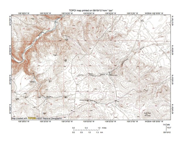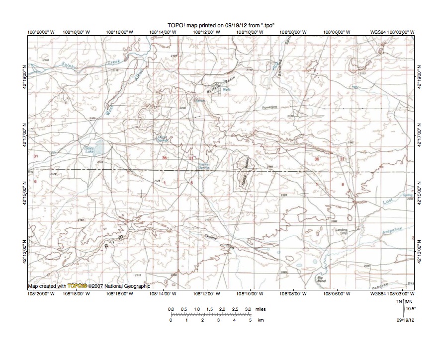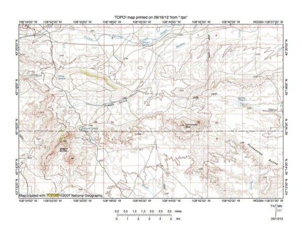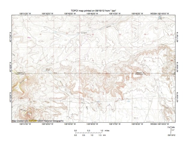Figure 9: West Alkali Creek-Lost Creek drainage divide area. United States Geological Survey map digitally presented using National Geographic Society TOPO software.