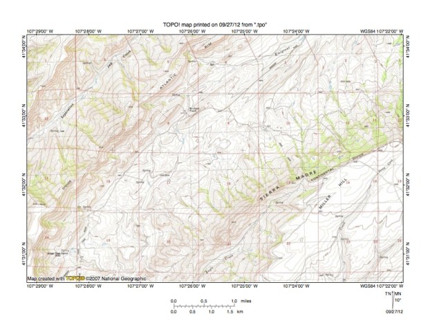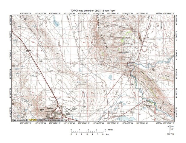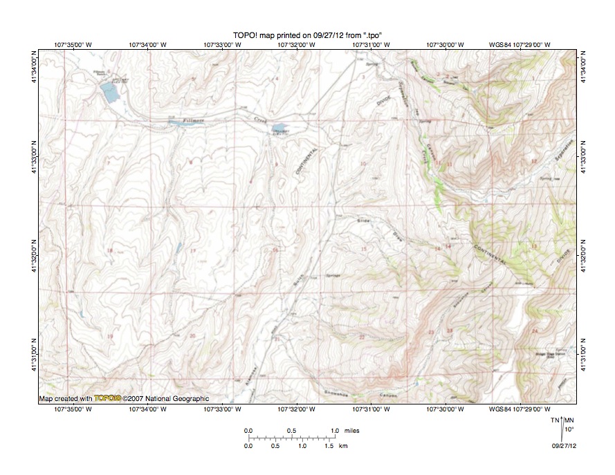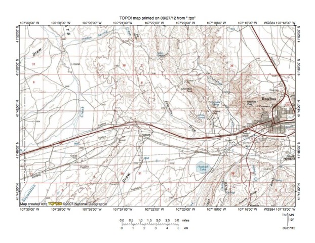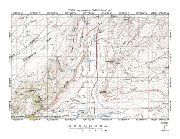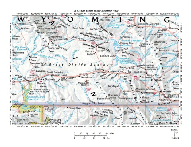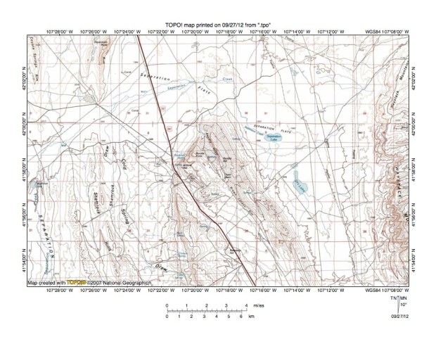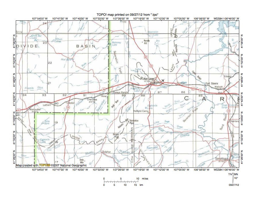 Figure 1: Separation Creek-Little Sage Creek drainage divide area along the Wyoming Great Divide Basin east rim location map (select and click on maps to enlarge). National Geographic Society map digitally presented using National Geographic Society TOPO software.