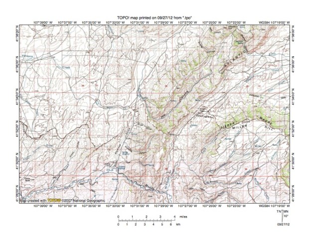 Figure 7: Sugar Creek-Little Sage Creek drainage divide area. United States Geological Survey map digitally presented using National Geographic Society TOPO software.
