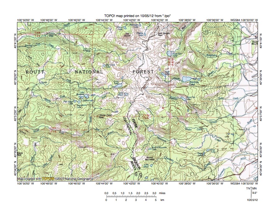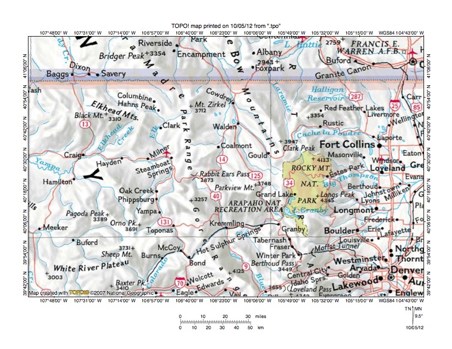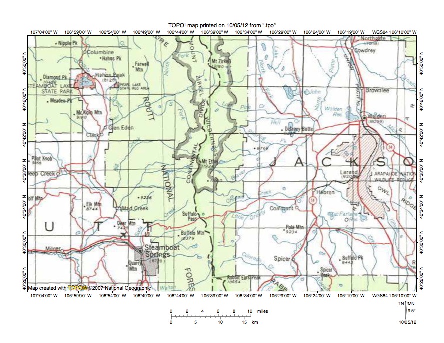 Figure 1: Elk River-North Platte River drainage divide area location map (select and click on maps to enlarge). National Geographic Society map digitally presented using National Geographic Society TOPO software.