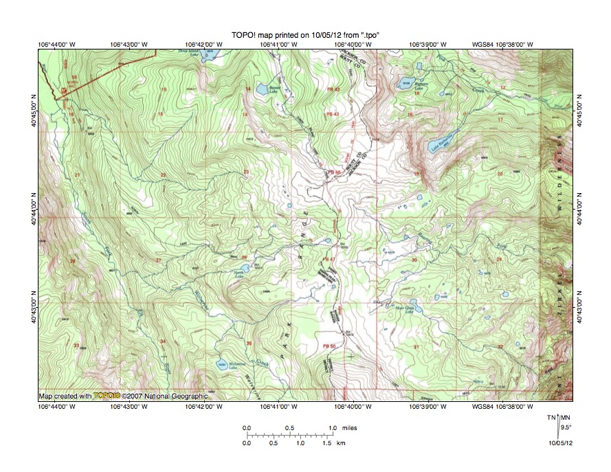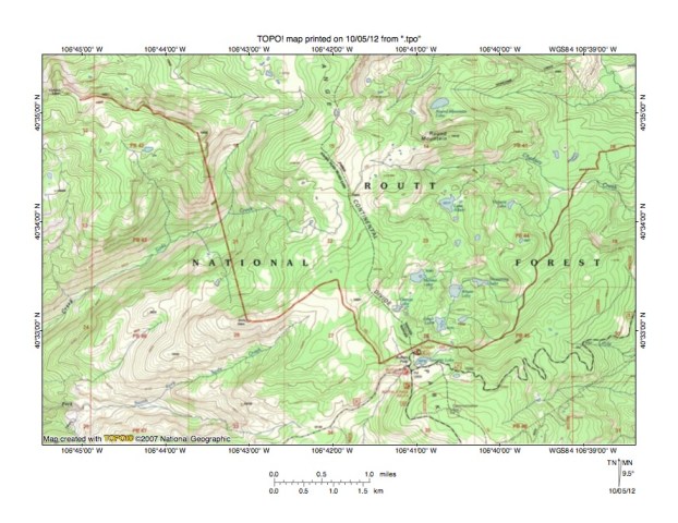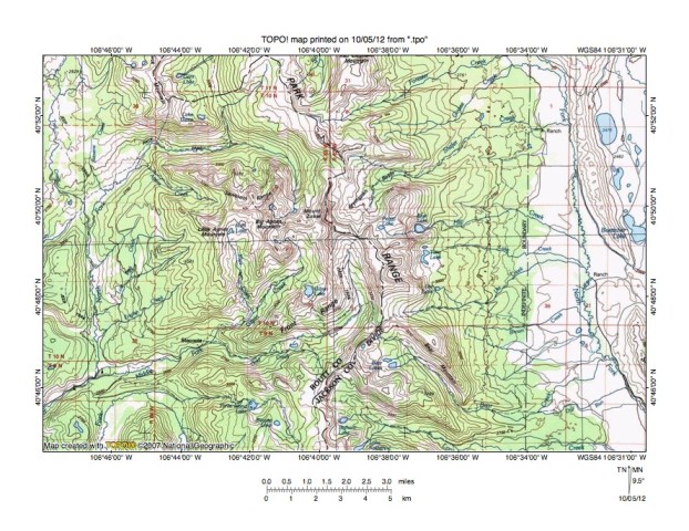 Figure 3: North Fork Elk River-North Fork North Platte River drainage divide area. United States Geological Survey map digitally presented using National Geographic Society TOPO software.