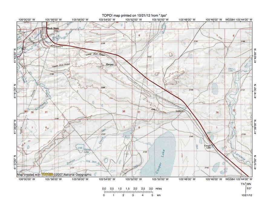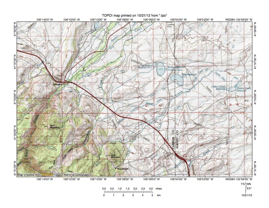 Figure 5: Rock Creek-Laramie River drainage divide area. United States Geological Survey map digitally presented using National Geographic Society TOPO software.