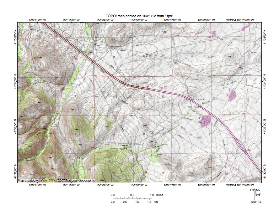Figure 10: Detailed map of the Laramie River-Bluegrass Creek drainage divide area. United States Geological Survey map digitally presented using National Geographic Society TOPO software.