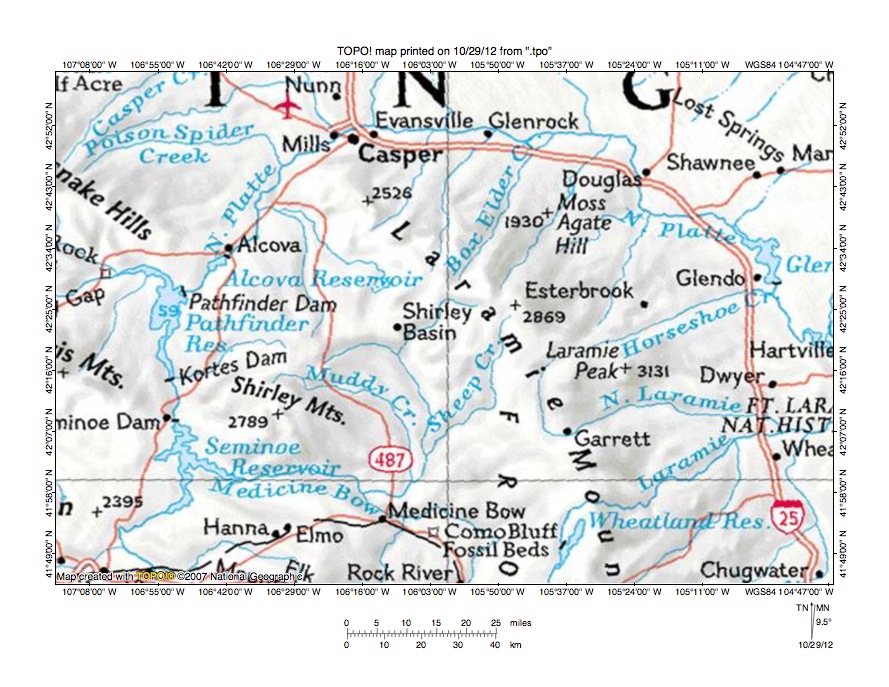 Figure 2: Detailed location map for North Platte River-Stinking Creek drainage divide area. United States Geological Survey map digitally presented using National Geographic Society TOPO software.