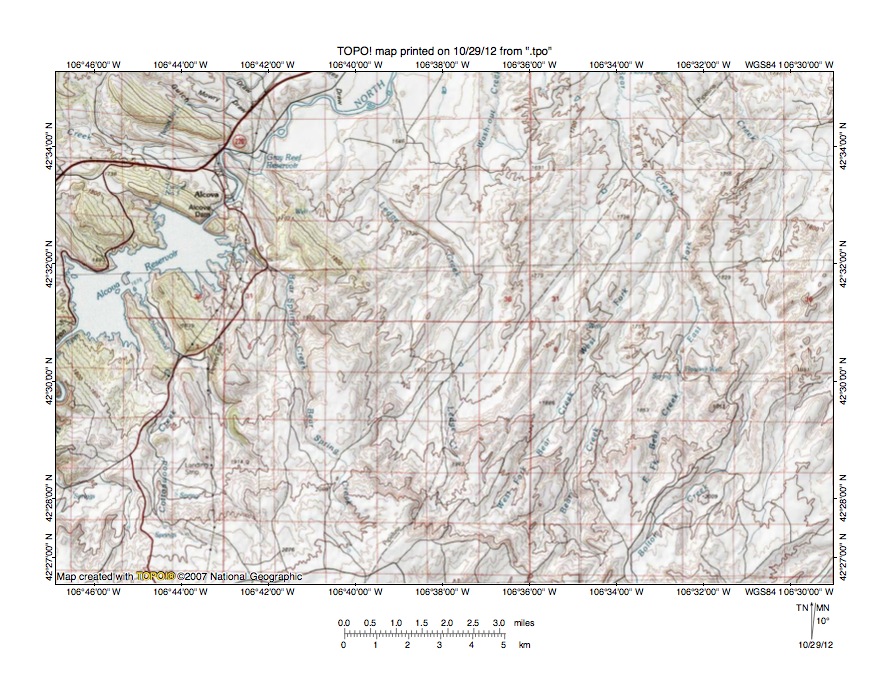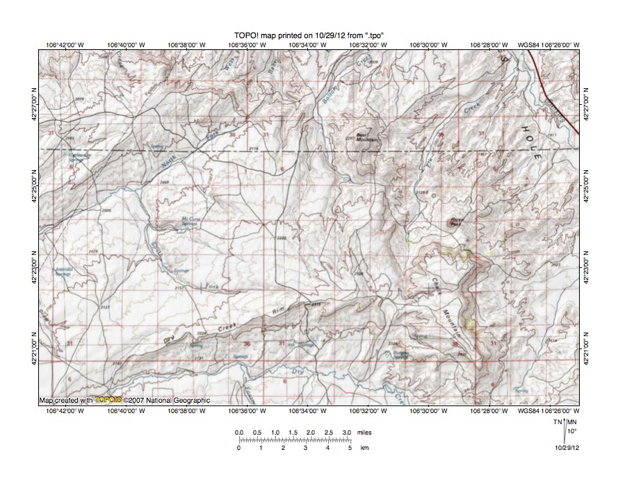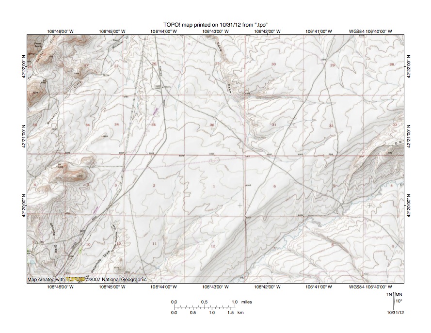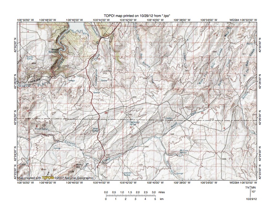 Figure 3: North Platte River-Bates Creek drainage divide area. United States Geological Survey map digitally presented using National Geographic Society TOPO software.