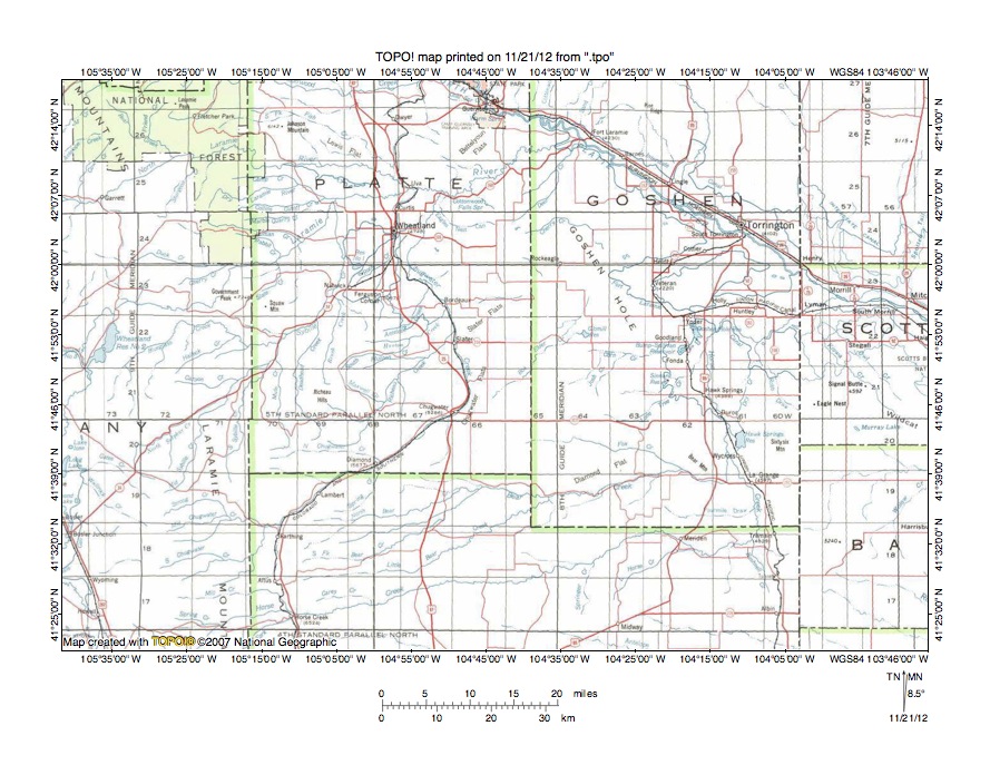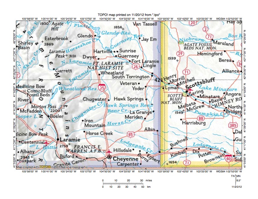 Figure 1: Chugwater Creek-Horse Creek drainage divide area location map (select and click on maps to enlarge). National Geographic Society map digitally presented using National Geographic Society TOPO software.